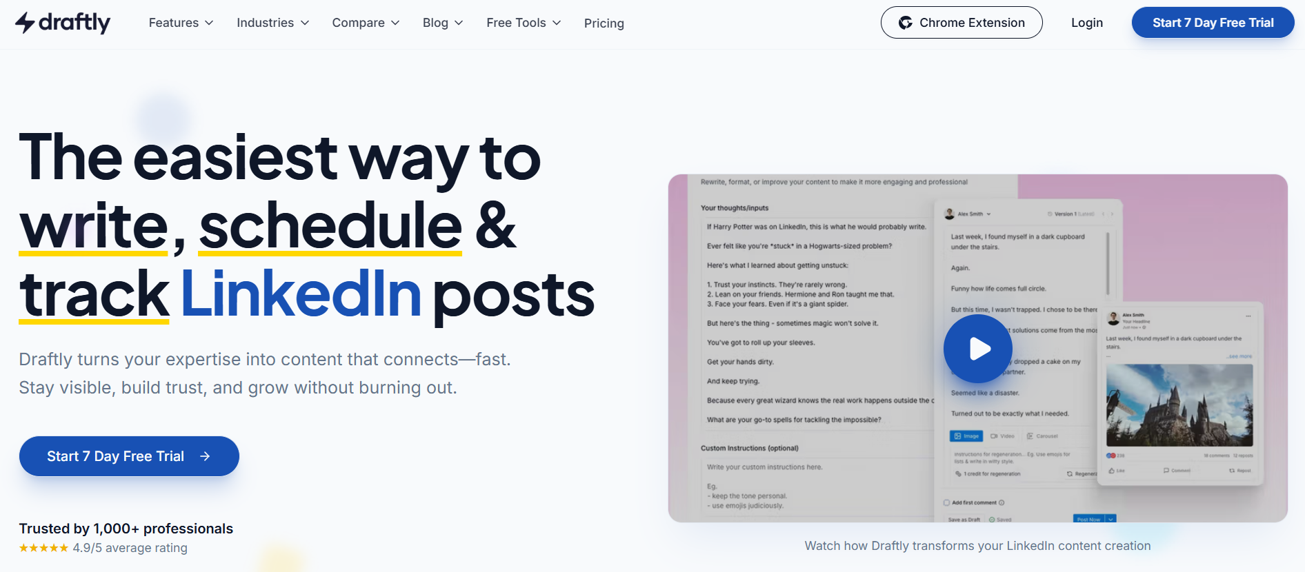Draftly AI helps maintain consistency and quality in LinkedIn publishing. Instead of writing posts manually or switching between tools, users can generate structured posts, convert ideas into carousels, and schedule content in advance. Its brand voice capability reduces generic outputs and supports a consistent professional tone.