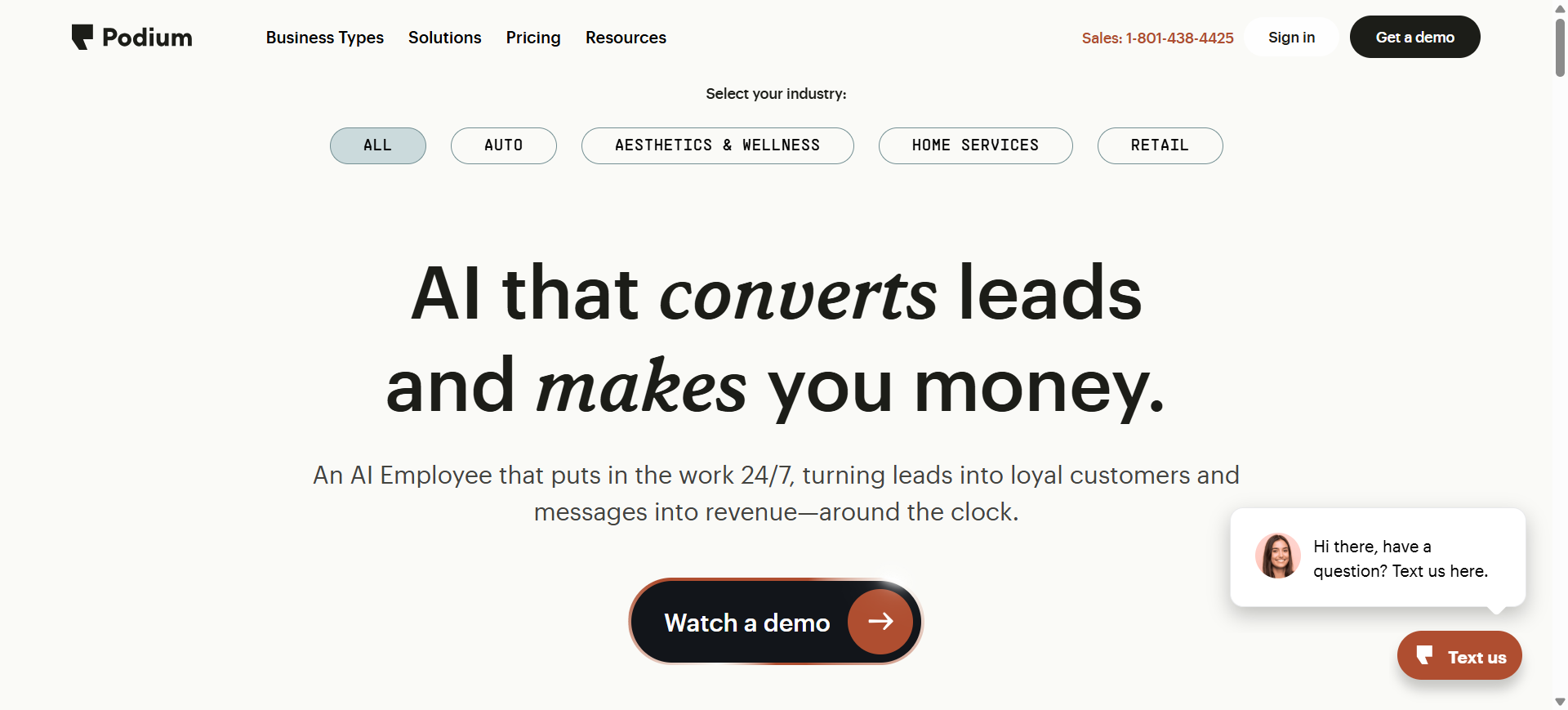 Podium provides conversational AI agents that interact with customers through messaging channels. These agents can answer inquiries, request reviews, and generate suggested responses to feedback, helping businesses maintain engagement with customers.