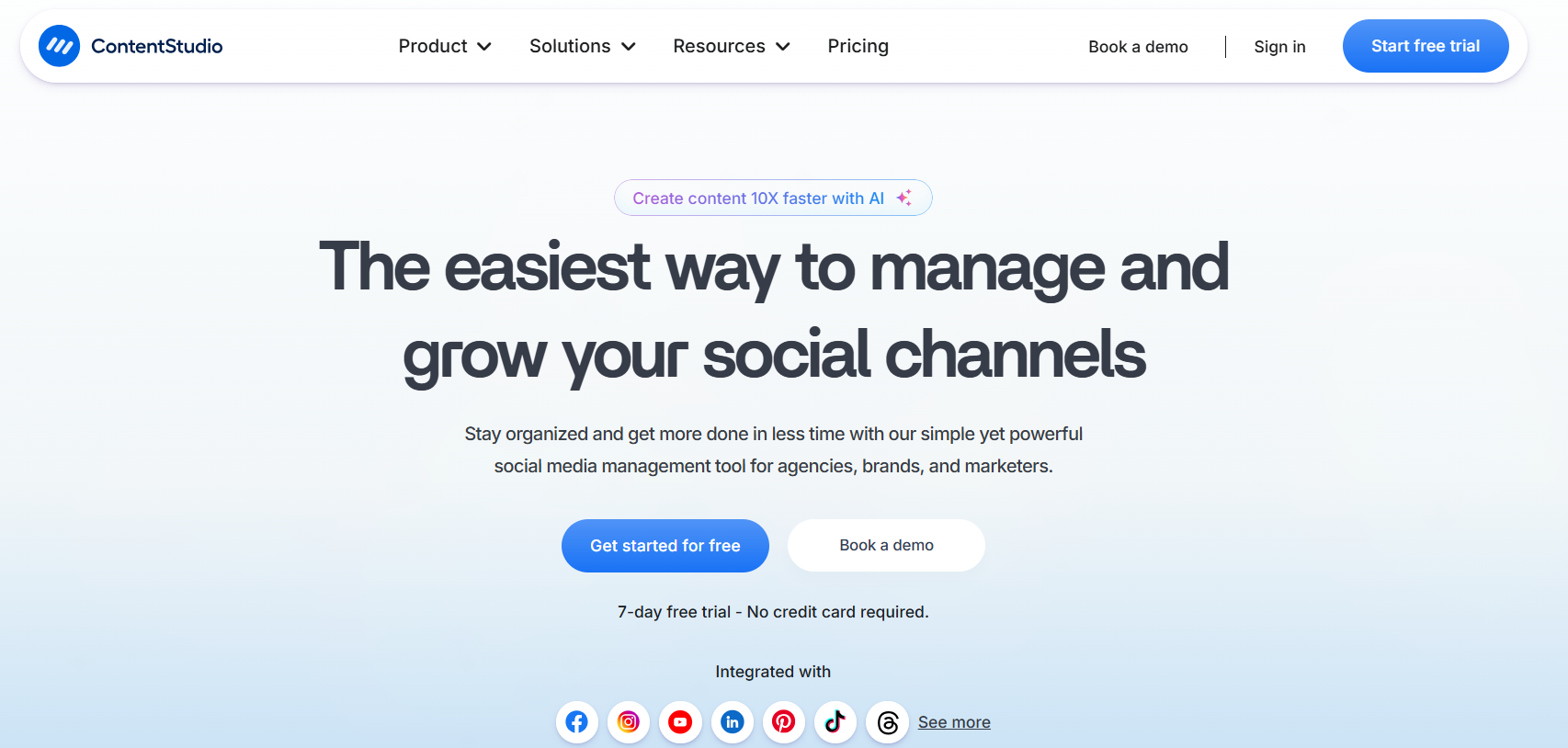 - Saves time by managing content creation, scheduling, and growth in one tool.